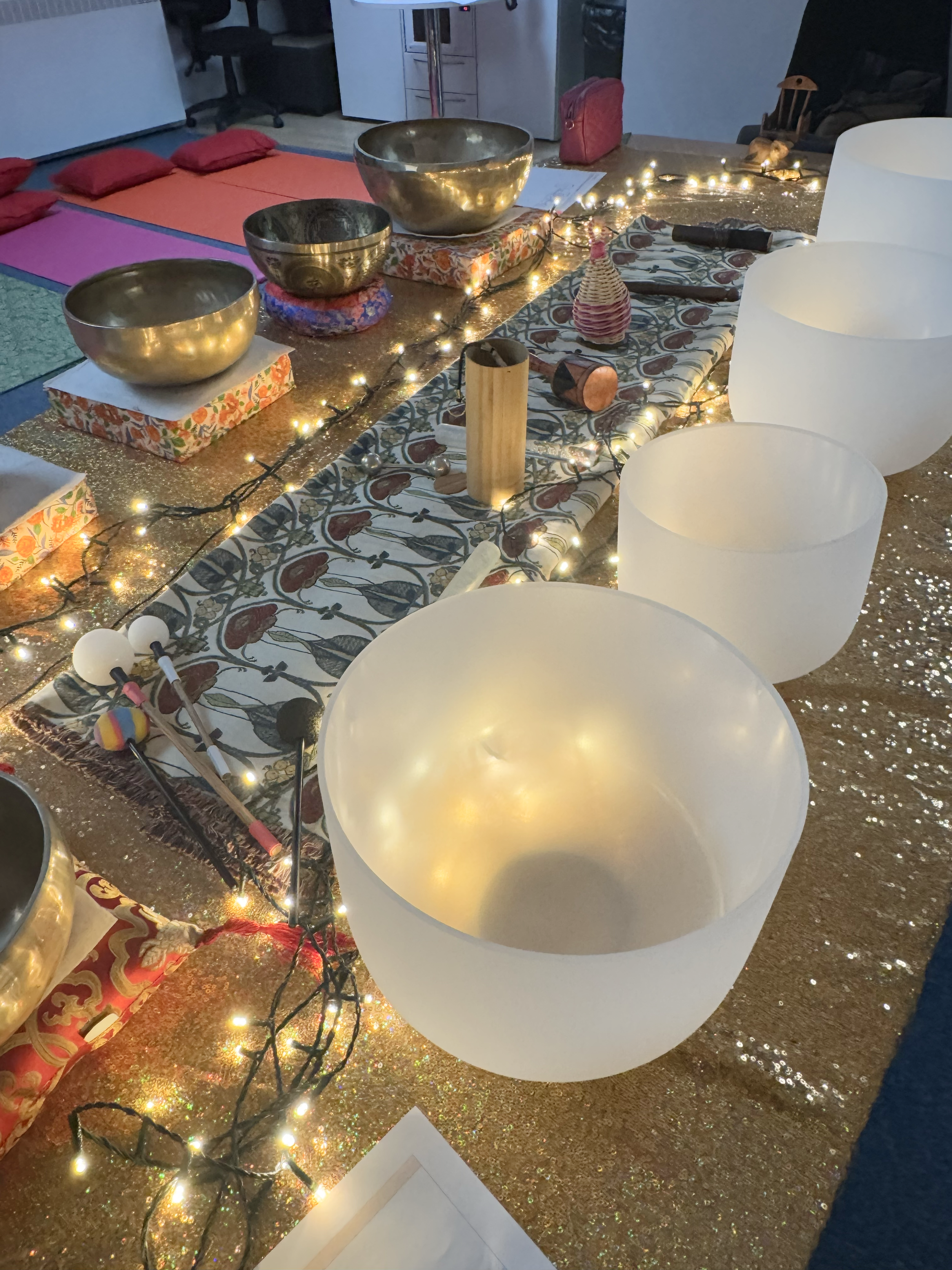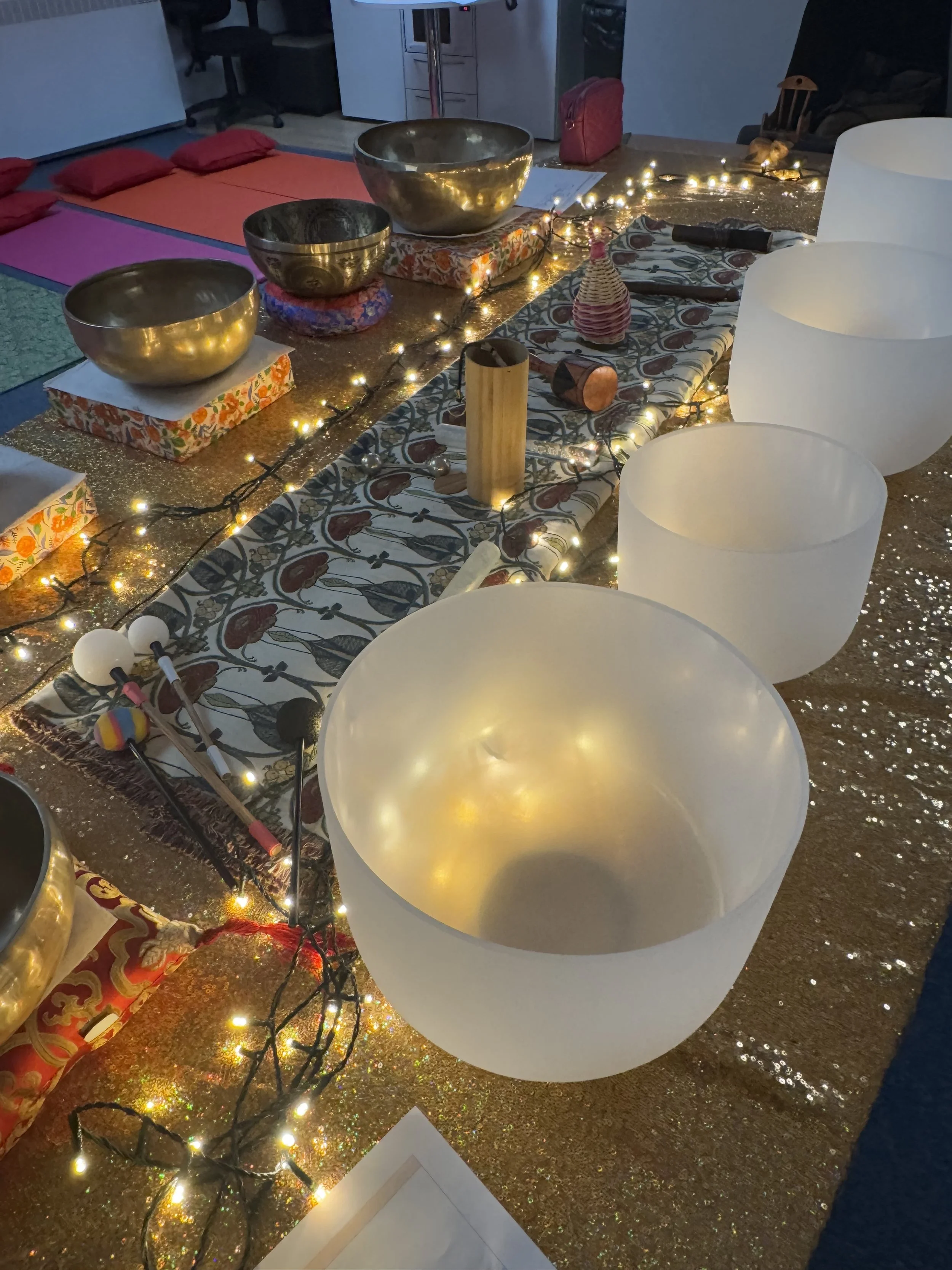 Group sound therapy uses carefully selected sounds and vibrations—such as singing bowls, gongs, chimes, drums, or guided vocal tones—to create an immersive, meditative experience. Participants typically sit or lie down while a trained facilitator leads the session, guiding attention toward sound, breath, and bodily awareness.